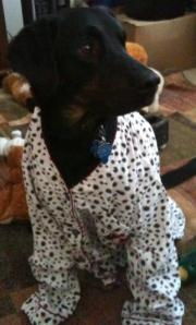 Pilot is the first dog I’ve had that tolerates being dressed up. In fact he loves it. Playing dress up, whether he is a bumblebee at Halloween, a reindeer at Christmas, pretending to be a dalmatian in my pajamas, or even just wearing a pair of pants on his head, is a fun game to him. This game involve lots of attention and laughter on my part and my Rottiepointador (rottweiler, pointer & labrador mix) just eats it up. Okay, I admit, it’s fun for me, too.