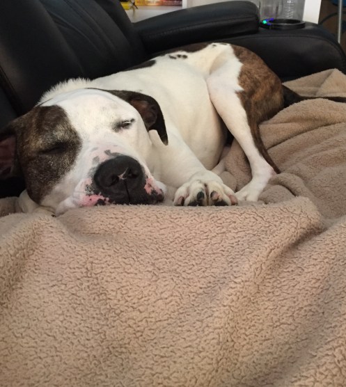Bailey is a 5 year old American Staffordshire Terrier. I firmly believe that the dog you need finds you. She’d been at the Humane Society for two months, as she apparently didn’t “show” well. I like to think she was holding out for me. When Pilot’s ashes were delivered and I cried until I triggered a migraine, Bailey snuggled up against me to give me comfort.
